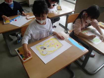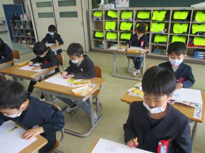 図画工作科の学習で自分の「すきなもの」を画用紙いっぱいに描きました。クレヨンを使って力いっぱい描くことができました。