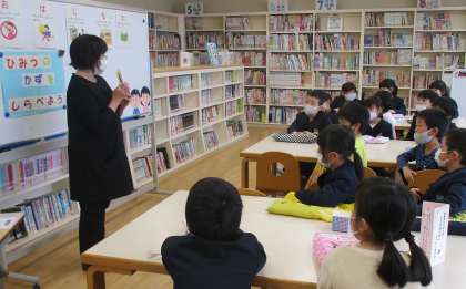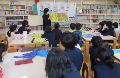 13日に1組の図書館オリエンテーションを行いました。学校司書より、本の歴史について教えていただいたり、お話を聞いてクイズに答えたりしました。「おっぱい、ふしぎいっぱい」のお話では、動物のおっぱいの数と生まれる赤ちゃんの数に関係があることを知って、みんな驚いていました。教室に帰ると、借りた本を熱心に読んでいました。これからも素敵な本にたくさん出会えるのが楽しみです。