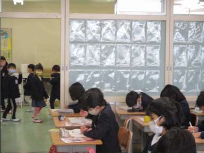 今日、授業中に1年生が学校探検で6年生教室に来て、学習する6年生の様子をじっと見ていました。1年生たちの目には、6年生たちはどのように映ったでしょうか。