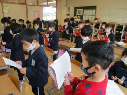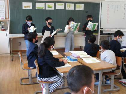 国語「ふきのとう」の学習では、自分で選んだ役になって音読をしています。声の大きさ、読む速さなど思い思いに工夫しています。