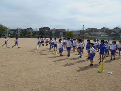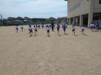 体育の様子です。スタートの仕方や足の出し方等、速く走るポイントを練習しました。その後、チームに分かれて折り返しリレーをしました。みんな力一杯走りました。