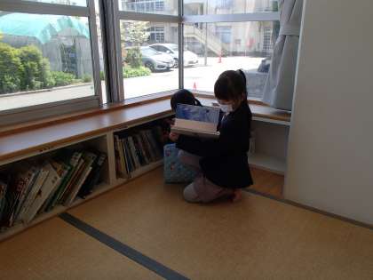 楽しみにしていた図書オリエンテーション。子供たちは、学校司書の「本」の歴史の話にびっくりしたり、図書室の使い方についてクイズで学んだりしました。一人1冊ずつ選んだ本を借りて、大満足です。