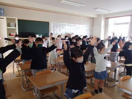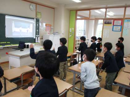 昨年度の6年生が踊っている動画を見ながら、真剣な態度で練習に取り組みました。