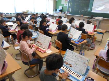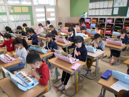 鍵盤ハーモニカの練習をしました。動画で指の動きを確認したり、実際に鍵盤に指を置いて運指の練習をしたりしました。その後、「ド レ ミ ファ ソ ラ ソ〜」とみんなで音を合わせて演奏しました。