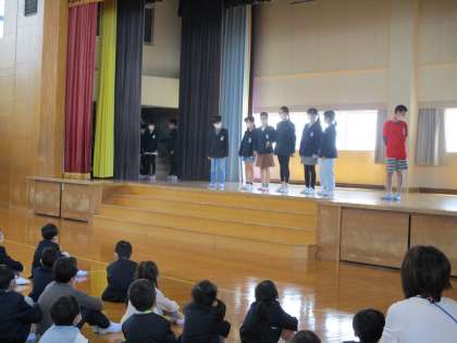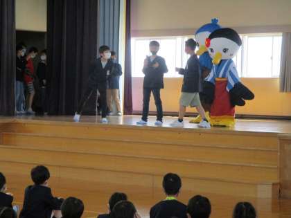 最初は、鵜坂っ子になるための約束事を確認したり、学校に関するクイズを出したりしました。途中からは、特別ゲストのうーちゃんやかいくんも登場し、1年生からは歓声があがりました。