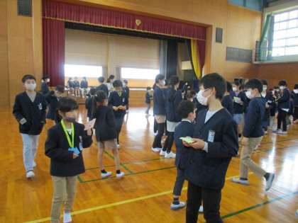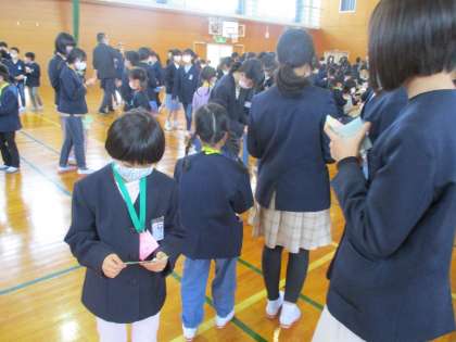 最後に名刺じゃんけんをしました。6年生とじゃんけんをして、6年生からメッセージ付きの名刺をもらうゲームです。名刺をたくさん手にした1年生は、とてもうれしそうでした。