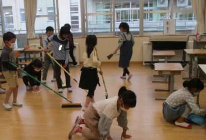 子供たちは、いつもより集中して隅々まで掃除をしています。