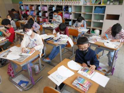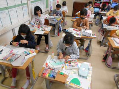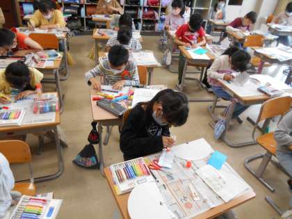 図画工作では、「くるくるランド」の作品を作っています。割りピンで固定した台を回して、いろいろな場面を表現します。自分で考えた場面をクーピーやマジック、色紙等を組み合わせて描きました。