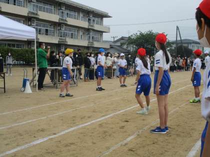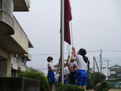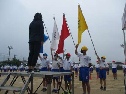 開会式では、国旗・校旗の掲揚があり、その後で各団の団長が校長先生を前に宣誓をしました。次は、準備体操。しっかりと体をほぐしました。