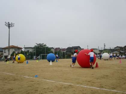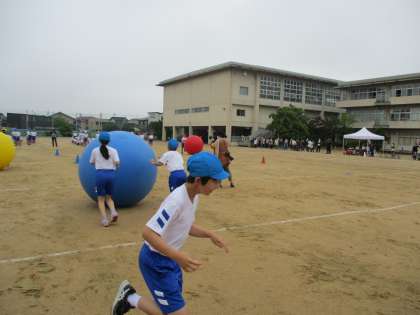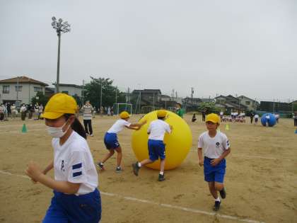 次の競技は、大玉転がしです。仲間と力を合わせる目当てにぴったりの競技です。