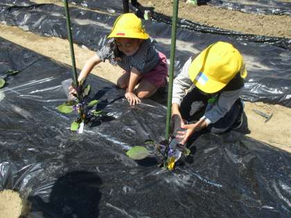 生活科「わたしたちの 野さいばたけ」の学習で、育てている自分の野菜に水やりをしました。咲いている花の数を数えたり、新しく出てきた芽をじっくり観察したりしていました。