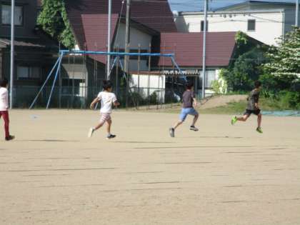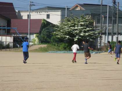 登校してきた子供から、グラウンドを3周しています。3周以上走っている鵜坂っ子もいます。