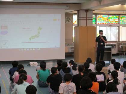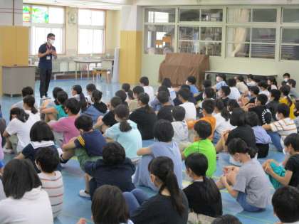 今日は、学年が集まり、東日本大震災が起きた当時、被災地に住んでいた本校の教員から当時の様子についての話を聞きました。教員の当時の詳しい状況の話に、子供たちは、真剣に聞いていました。