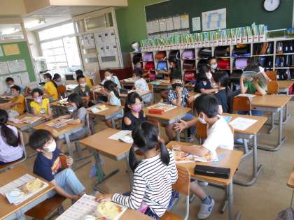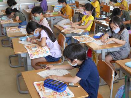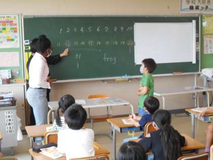 外国語活動では、1〜20までの数の数え方を学習しています。今日は、数を数えながら線つなぎをしたり、ペアでゲームをしたりしました。学習の最後には、ALTの先生と勝負するなど、大いに盛り上がりました。