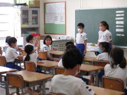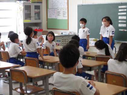 朝の会で日直がスピーチをしています。 スピーチを聞いた仲間は、日直に質問します。