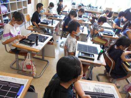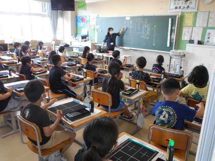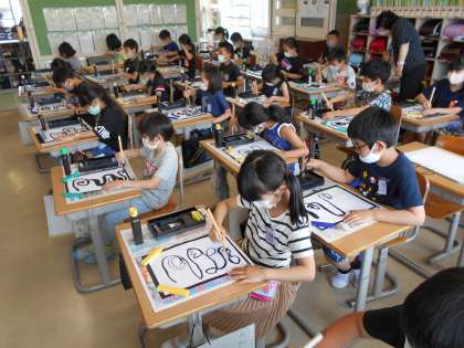 3年生から、毛筆の学習が始まりました。習字道具の名前や置き方、筆の持ち方について学習しました。その後、筆にどれくらい墨を含ませるときれいな線が書けるか、練習しました。