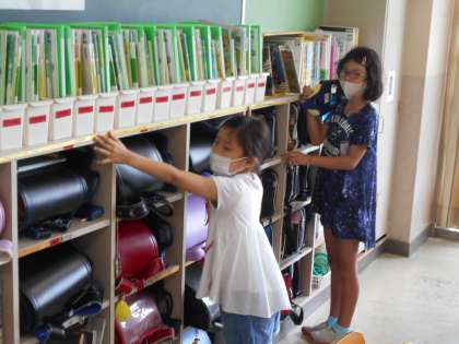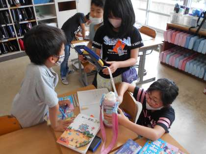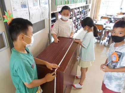 算数で学習した巻き尺で、いろいろなものの長さを測りました。水筒のように円いものや、ロッカーの横の長さ等、友達と協力して正確に測ることができました。