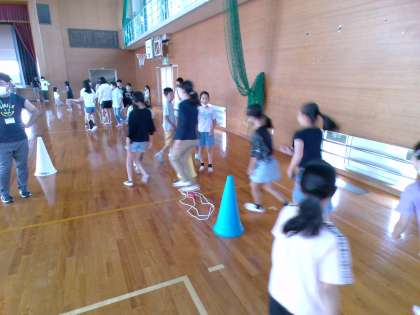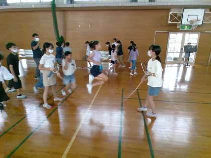 長なわ跳びの実力を高めたい子供たちは、体育館で練習しました。