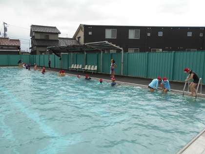 今年度初めてプールに入りました。子供たちの中には初めて大プールに入る子供もいて、少し緊張気味の様子が見られました。プールの約束「さしすせそ」を守りながらも、楽しく活動していました。