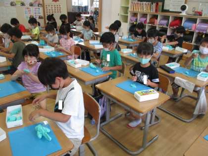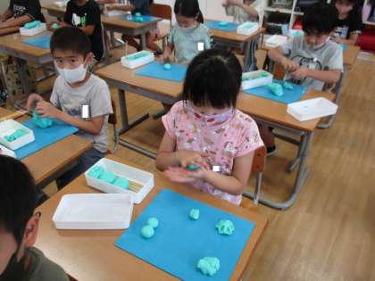 図画工作「にぎにぎねん土」では、握った粘土の感触や形からイメージを広げ、思い思いに表しました。