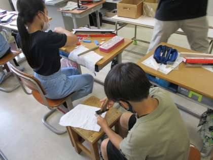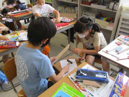 色をつけた木を組み合わせて、金槌でトントン打っています。