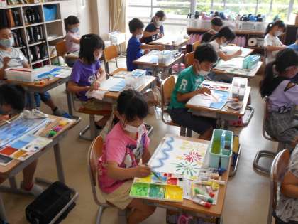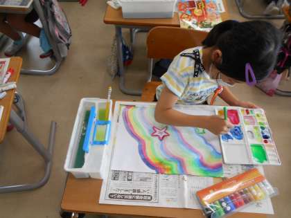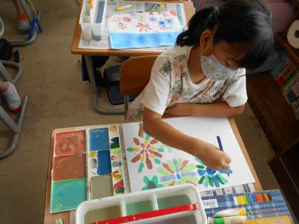 明日から7月ということで、7月をテーマに絵を描きました。夏の様子を表す色を選び、自分で想像を膨らませて絵を楽しんで描きました。