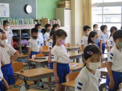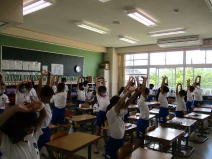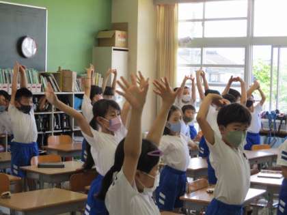朝の活動後は、保健委員会の校内放送に合わせて、背筋を伸ばし、よい姿勢を確かめています。