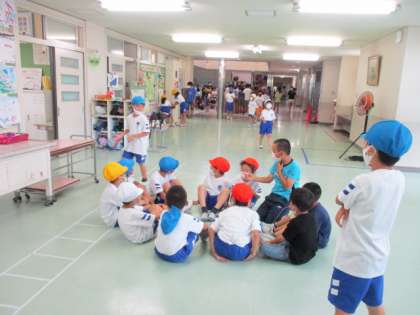 雨でグラウンドに出ることができない日は、ワークスペースで工夫して遊んでいます。