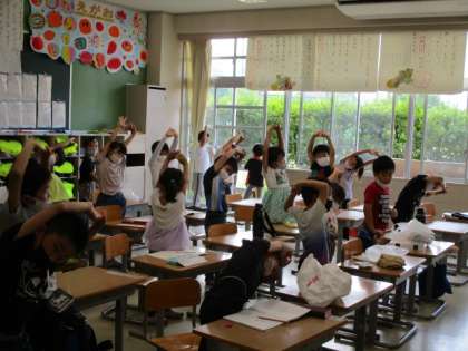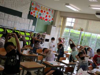 保健委員会の校内放送に合わせて、背筋をしっかり伸ばします。