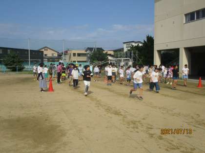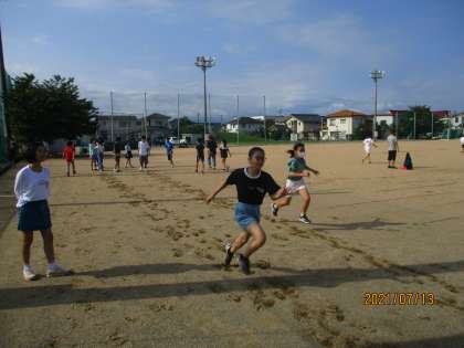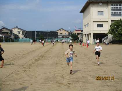 6年生は昨日からグラウンドでのトレーニングに切り替え、体力づくりをしています。9月に行われる予定の大会での好記録を直近の目当てとし、一人一人がトレーニングに励んでいました。