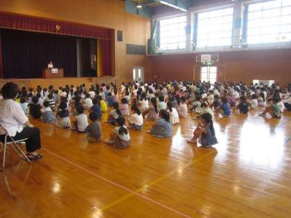 1学期の終業式に臨みました。校長から1学期にがんばっていたことの話を聞いたり、1年生の代表がたくさん友達ができたことを発表したりしました。みんな、よい姿勢で話を聞こうとする姿や、元気よく校歌を歌う姿が立派でした。