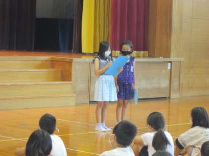 1学期の終業式を行いました。背筋を伸ばして、校長や代表児童の話を聞いていました。終業式後は各クラスで夏休みの生活についての話を聞きました。