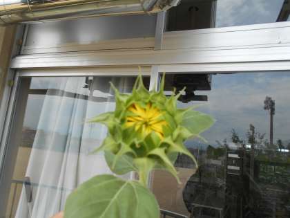 8月2日の朝、ヒマワリのつぼみが少し開いて、中から黄色の花びらが見えるようになっていました。