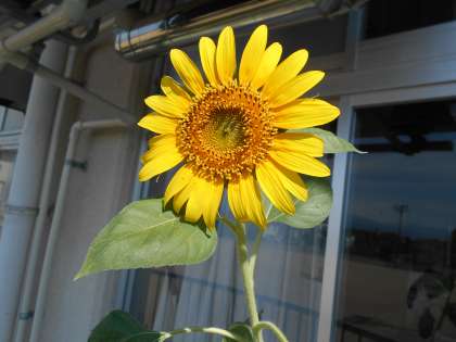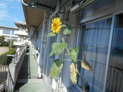 8月6日、花が咲きました。花までの高さは1メートルを超えています。晴天の下、鮮やかな黄色のヒマワリがまぶしくゆれていました。暑さに負けず、元気に育っています。