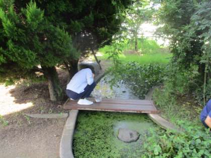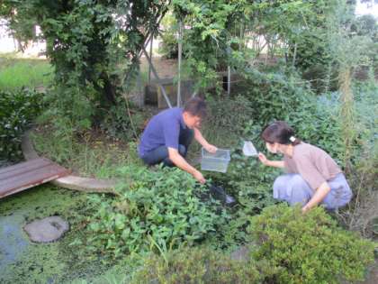 さて、1学期に総合的な学習の時間は、ハッピースクールプロジェクトを行いましたね。その活動の中には、ビオトープの清掃がありました。あれから2か月ほど経ち、6年担任で様子を見たり、少し藻を取り除いたりしました。たくさんのメダカが元気よく泳ぎ、大きなカエル、小さなヘビもいましたよ。きっと、このビオトープの居心地がいいんでしょうね。