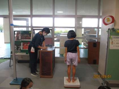 先日、発育測定を行いました。養護教諭の話をしっかり聞いて真剣な態度で臨みました。心も身体も大きくなった子供達。2学期も元気いっぱい過ごします。