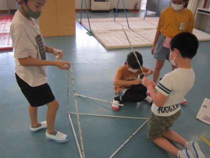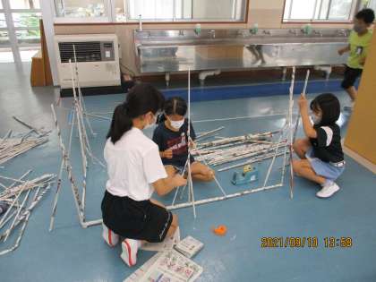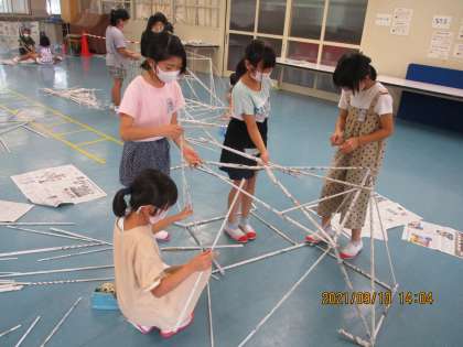 新聞紙を細く丸めたものを、縦へ横へ自由に繋いでいきました。夢中になって取り組んでいました。