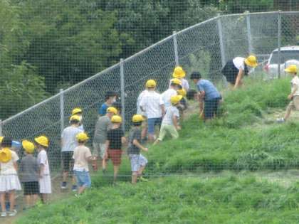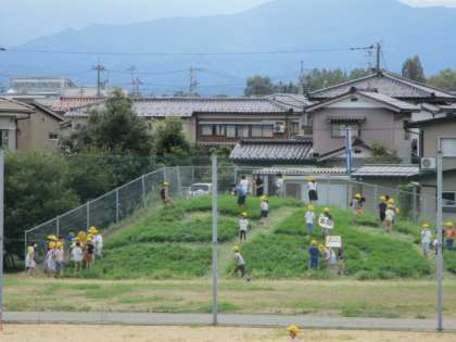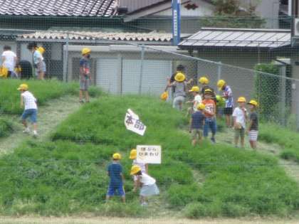 芸術的に草が刈られた築山は、鵜坂っ子の人気の遊び場です。