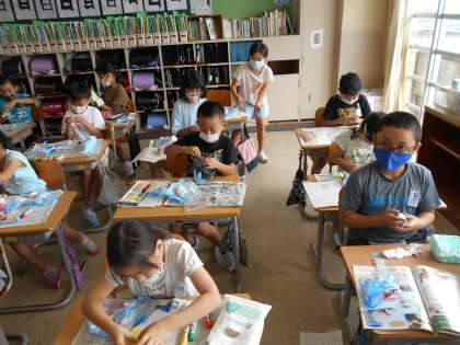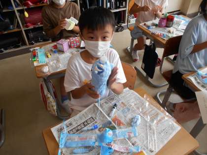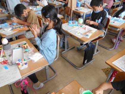 図画工作では、ペットボトルやお菓子の容器を使って、小物入れをつくりました。紙粘土に絵の具で色を付け、容器に付けていきます。生き物をイメージした形や、周りに星を付けたもの等、思い思いの小物入れをつくることができました。