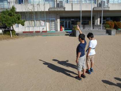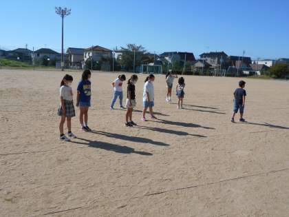 国語科で、「ちいちゃんのかげおくり」の学習をしています。今日は、まさに「かげおくりのできそうな空」だったので、子供たちとかげおくりをしにグラウンドへ出ました。初めてかげ送りをする子供も多く、なかなかうまくできませんでしたが、こつをつかんでいろいろなポーズを試していました。