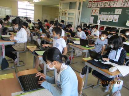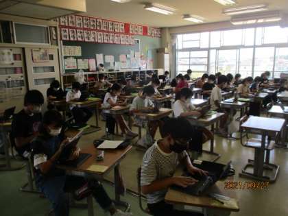 総合的な学習の時間で子供たちは、鵜坂について調べたことをタブレットを使ってまとめる作業をしています。文字の大きさや背景、画像の挿入等を考えながら資料づくりをしており、情報収集能力だけではなく、タブレットを使いこなす技能も高めてきています。