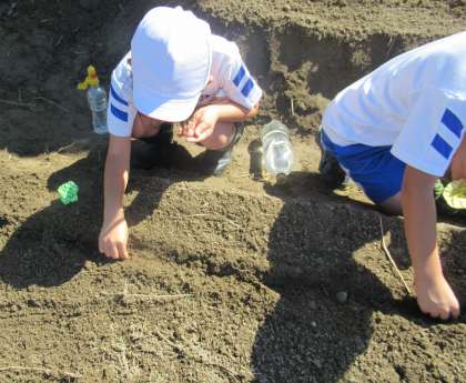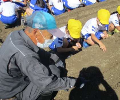 夏野菜は苗から植えましたが、今回は種からです。子供たちは栽培ボランティアの方に植え方を教えていただくと、一粒一粒大事そうに撒いていました。