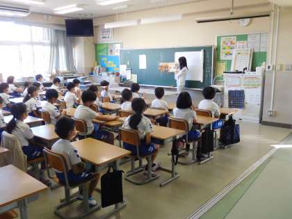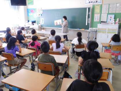 今学期初めてのお話ワールドでした。朝から楽しみにしていた子供たち。集中して聞いていました。1、2組の様子です。