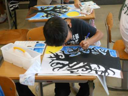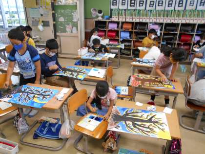 国語科の「モチモチの木」を題材に絵を描きました。画用紙いっぱいに枝を伸ばしたり、灯をともしたりと、好きな場面のモチモチの木を自分なりに表現している子供たちでした。