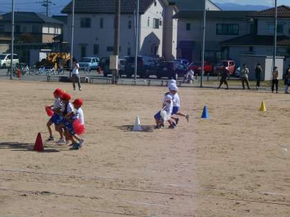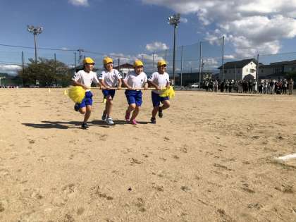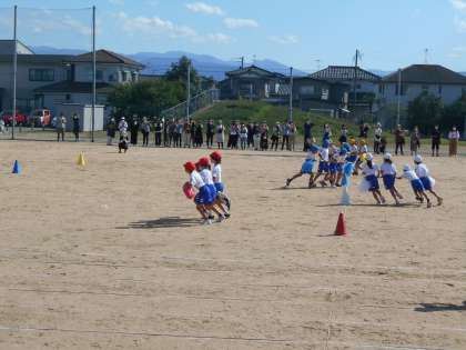 団体競技「タイフーン」の様子です。みんなで協力してゴールを目指しました。