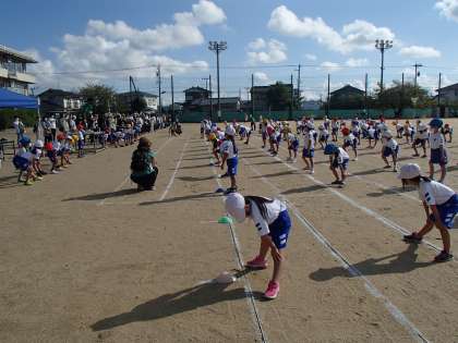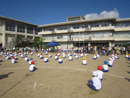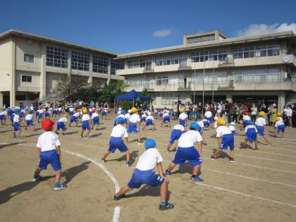 晴天に恵まれ、1年生のスポーツフェスティバルが始まりました。まずは、準備体操です。