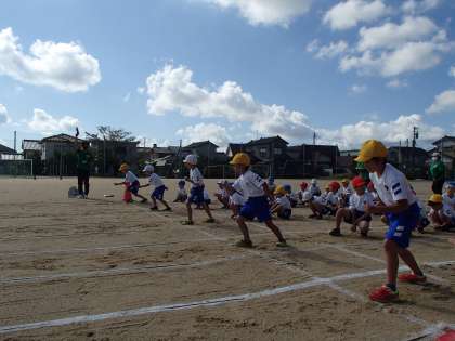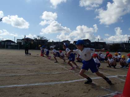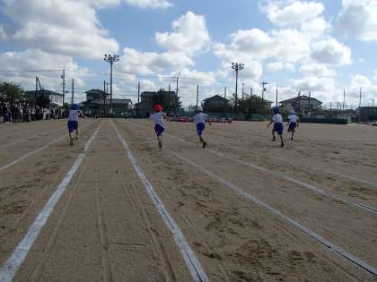 「位置について、バン」元気いっぱい走り出す子供たちです。保護者の方の温かい拍手に迎えられ、うれしそうにゴールしていました。