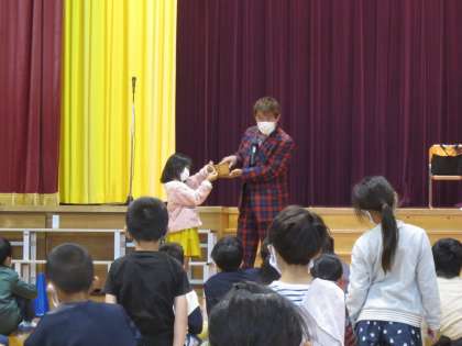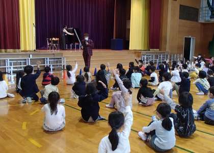 本物のマジックやイリュージョンを間近に見ることができて、みんな大喜びでした。マジシャンのコンプレッサーさんから、「マジックを楽しむこつは、よく見て、よく聞いて、よく考えること」だと聞き、どうしてトランプが次から次から出てくるのか、どうして切ったはずのひもがつながっているのか、うんうんうなりながら釘付けになってマジックを見る子供たちでした。