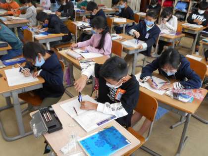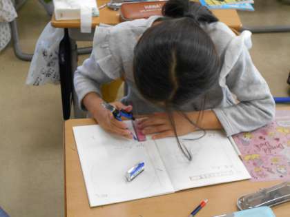 算数科では、円と球について学習しています。今日はコンパスを使って円をかきました。始めはうまくコンパスを回転させることができなかった子供たちですが、いくつも円をかいていくと、だんだん上手になっていきました。半径の大きな円や、小さな円を楽しんでかくことができました。