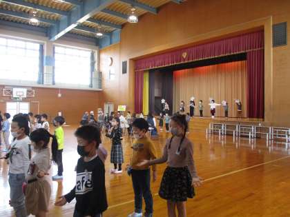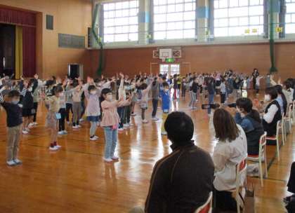 「ダンス えがおでチャレンジ」では、元気いっぱいダンスを踊りました。「ほら、スマイル」のポーズでは、ボランティアの方々や保護者の方々が参加してくださって、子供たちものりのりです。